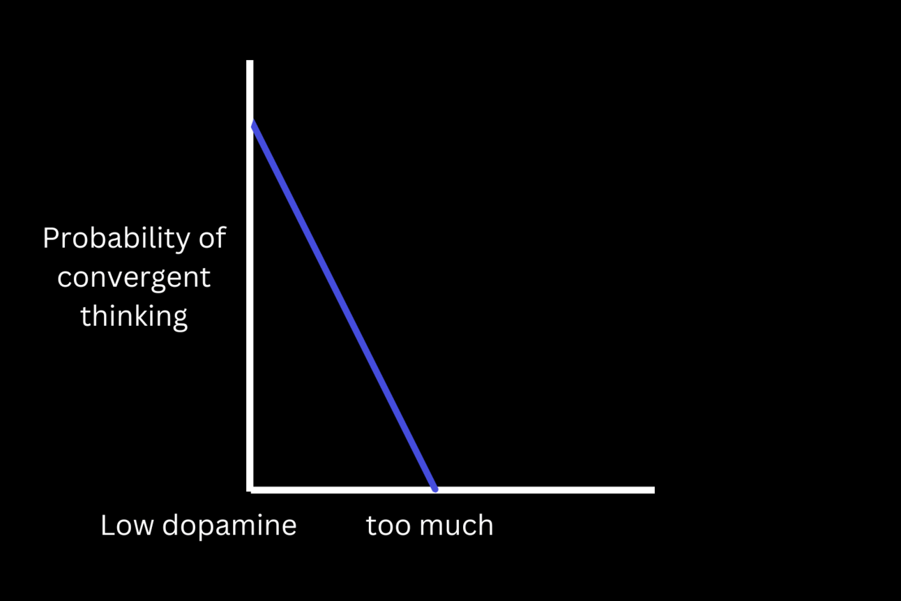 Divergent thinking is more probable with high levels of dopamine, but when dopamine is too high or low, it cuts off.